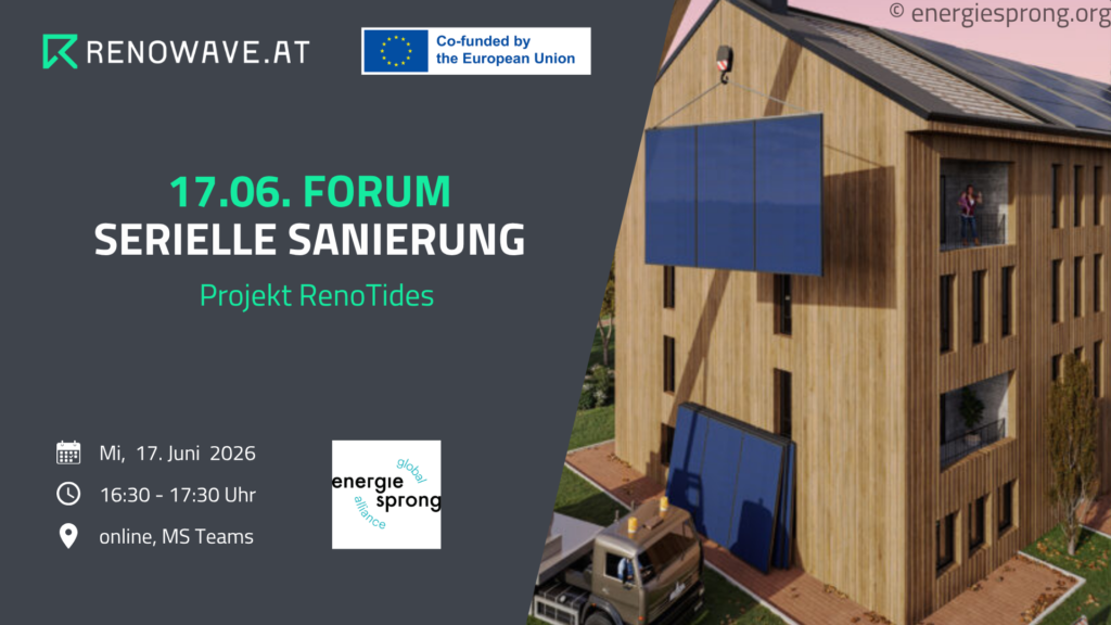 Wir laden Sie herzlich zum Forum „Serielle Sanierung“ ein – einer kompakten Online-Veranstaltung, in der Unternehmen, Technologieanbieter und Interessierte sowie Gebäudeeigentümer:innen ihre Expertise und Innovationen zum Thema serielle Sanierung austauschen und vorstellen können. Im Juni dreht sich alles um die Ergebnisse aus dem Projekt RenoTides!
